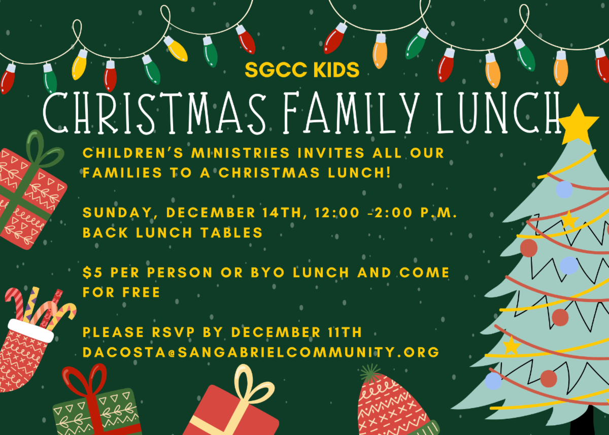 Please pick up a blank Christmas card from either the Sanctuary Lobby or your Sunday School class and then return it with a $10-25 gift card, by Sunday December 14th. Gift cards will be given to San Gabriel teenagers who come from financially struggling families, in conjunction with the city’s Holiday Basket program. This generous donation blesses our community and is a tangible way to share the love of Christ this season. Questions? dacosta@sangabrielcommunity.org