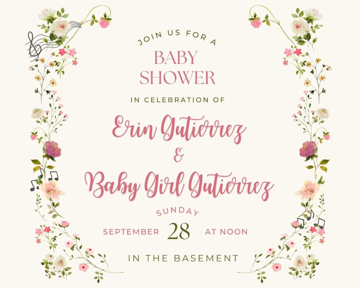 All ladies are invited to join us for Erin Gutierrez's baby shower! Please bring a main dish to share. Dessert & drinks will be provided. No nuts, please!