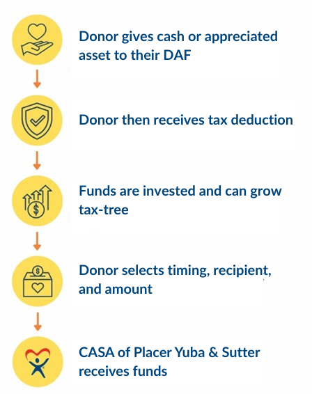 Ready to make your giving more purposeful and tax-savvy? A DAF could be the smart, rewarding solution you're looking for. Speak with your financial advisor to learn how you can support CASA of Placer, Yuba & Sutter.