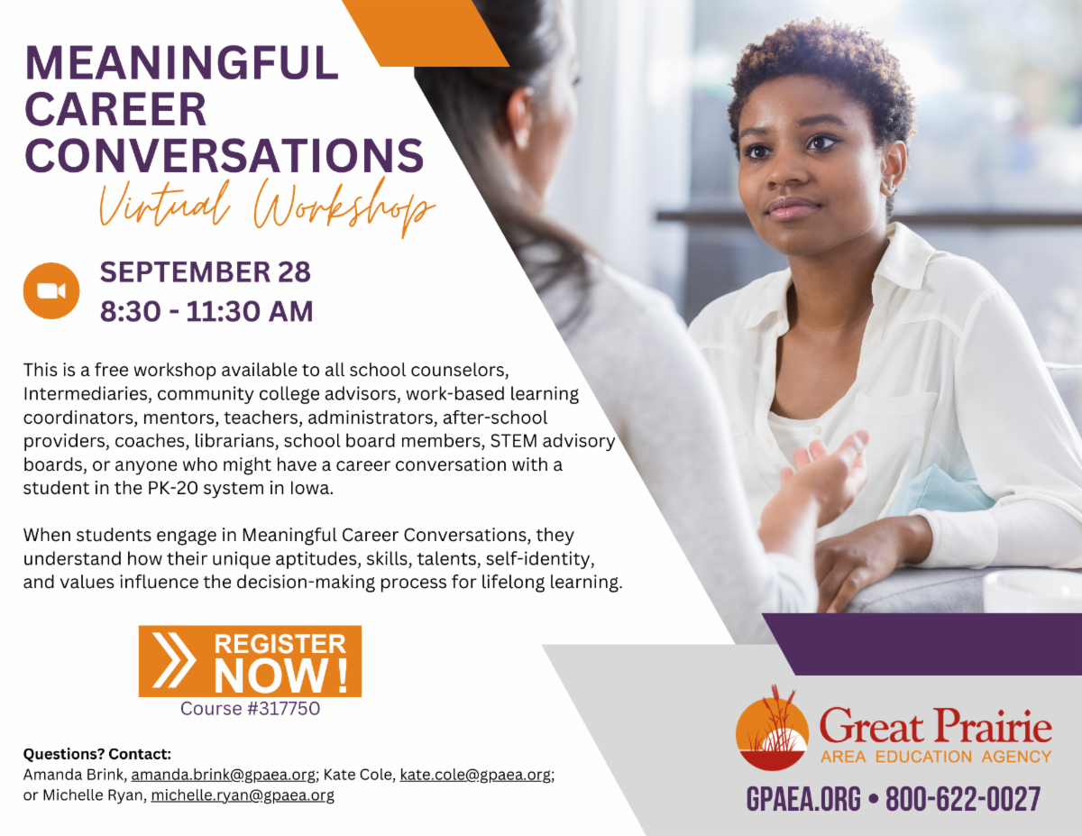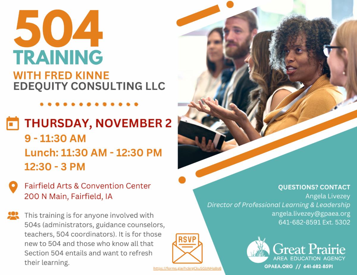 It is the policy of the Great Prairie Education Agency not to discriminate on the basis of race, color, national origin, sex, disability, religion, creed, age (for employment), marital status (for programs), sexual orientation, gender identity, and socioeconomic status (for programs) in its educational programs and its employment practices. There is a grievance procedure for processing complaints of discrimination. If you have questions or a grievance related to this policy, please contact Nathan Wood, 2814 N. Court, Ottumwa, IA 52501, (641) 682-8591 x5512, nathan.wood@gpaea.org (employment practices) or Angela Livezey, 2814 N. Court, Ottumwa, IA 52501, (641) 682-8591 x5302, angela.livezey@gpaea.org (educational programs). |