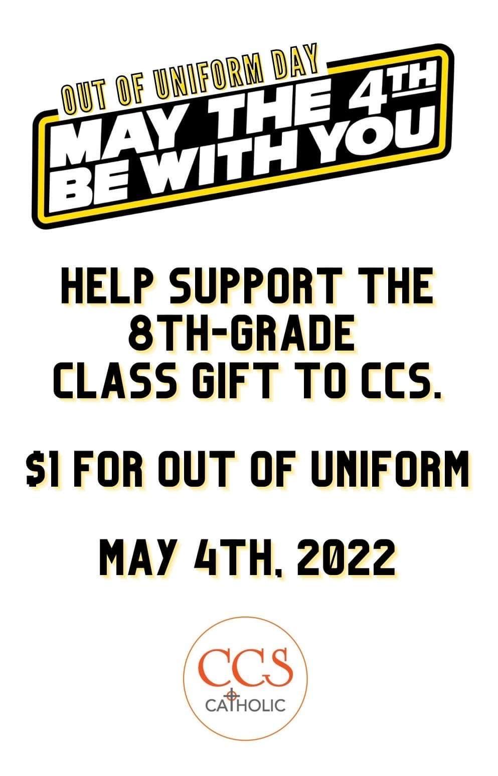 Our 8th graders will be sponsoring an out-of-uniform day on May 4th to help raise money for their class gift. The cost is $1.