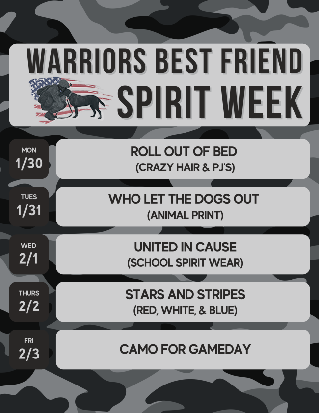My name is Kate Vulje, and I’m a Junior at Liberty North High School. The week of January 30th through February 3rd, Liberty North and Liberty High Schools are partnering in a fundraiser for Warriors Best Friend. This organization supports both schools and military veterans by providing therapy dogs. This initiative will conclude the evening of the basketball match between Liberty North vs. Liberty on Friday, February 3rd at 7 p.m. at the Liberty North Fieldhouse. This same evening will also be a Cancer Awareness night - Once again the Liberty North, and Liberty High school communities will stand as ONE COMMUNITY to bring awareness, and fight against Cancer!