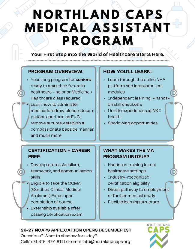 The Northland Career Center application for the 26-27 school year has officially opened. Click here to apply. Make sure to come to the counseling office and schedule your shadow visit with Ms. Stukes (the shadow is required for your application)