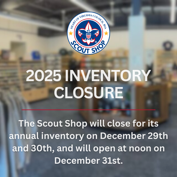 The Scout Shop will close for its annual inventory on December 29th and 30th, opening again at noon on December 31st. Please plan your shopping for December awards accordingly! Did you know you can use the Scout Shop Online Order Request Tool and order for pickup in store, curbside or have it shipped to you?