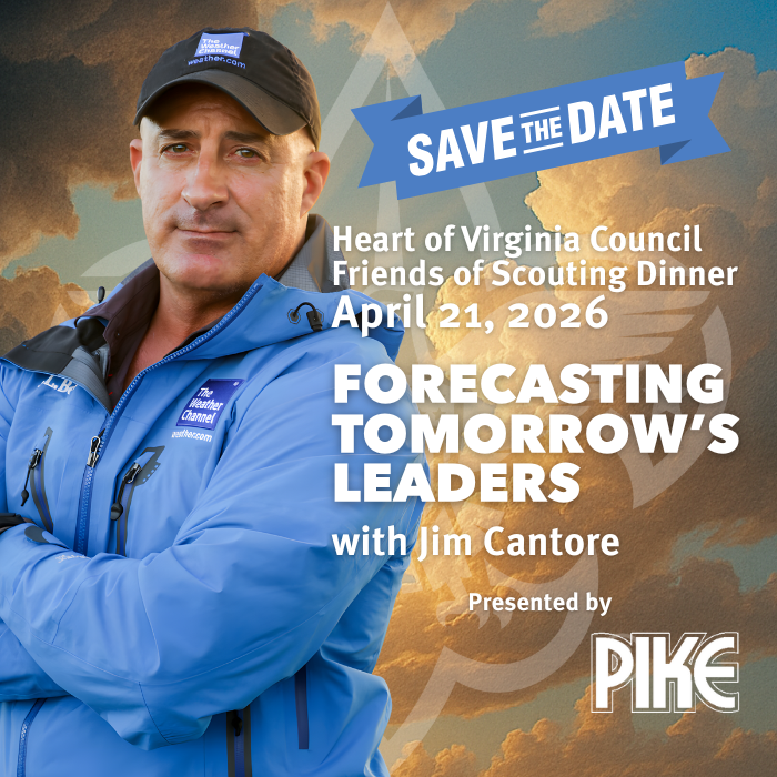 Normally when Jim Cantore shows up, you prepare to evacuate… but this time, you’ll want front-row seats! Join us April 21, 2026, for our annual Heart of Virginia Council Friends of Scouting Dinner, proudly sponsored by Pike, where we’re Forecasting Tomorrow’s Leaders. You're invited! Visit the link below and make a donation of at least $300 to save yourself a seat for what we know will be another exciting and successful event.