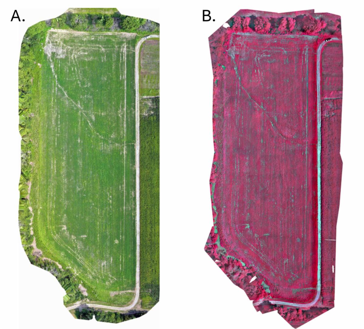 Figure caption: Drone imagery captured with A) RGB and B) multispectral cameras. These images are of the same agricultural field planted in soybeans, using a combination of hundreds of photos “stitched” together to create a highly detailed image called an orthomosaic.