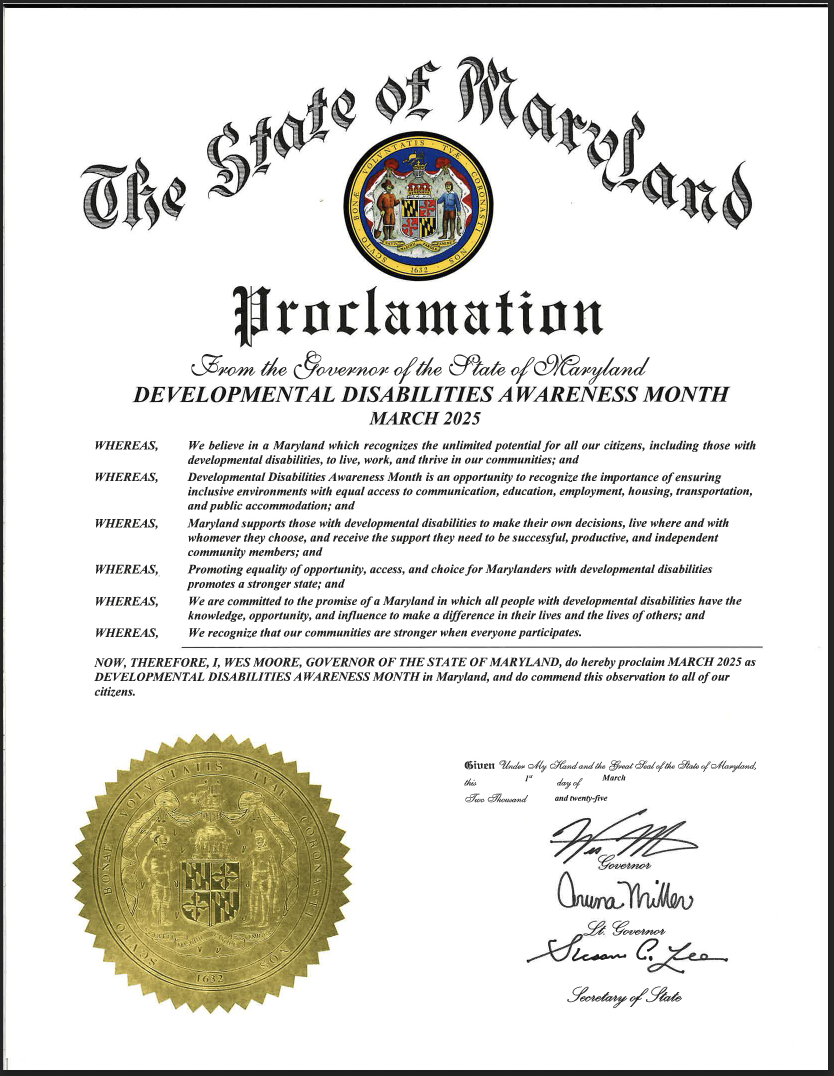 Governor Wes Moore has proclaimed March as Developmental Disabilities Awareness Month in Maryland, recognizing the unlimited potential of Marylanders with intellectual and developmental disabilities. Developmental Disabilities Awareness Month is observed nationwide every March to promote understanding, inclusion, and advocacy for individuals with intellectual and developmental disabilities. The Developmental Disabilities Administration is excited to showcase not only the great work that our team, providers, vendors and stakeholders continue to do to improve the lives of those who receive services and supports, but also to bring continued attention to the achievements of those individuals who are thriving in the communities in which they choose to live, work, play, and engage. To celebrate, the Developmental Disabilities Administration devotes this entire edition to highlighting a few inspiring stories you shared with us!