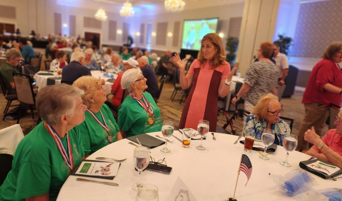 | | Parks and Recreation Director Marc Manfre addresses the hundreds of seniors in attendance. | Delaware County Council Member Elaine Paul Schaefer chats with proud medal winners. | Pictured (left to right) Delaware County Controller Joanne Phillips, County Council Chair Dr. Monica Taylor, Chief of Social Services and Community Programs Sandy Garrison, Parks and Recreation Director Marc Manfre, COSA Director Barbara Nicolardi, and Parks and Recreation Deputy Director Ann Stauffer with a table of athletes from Riddle Village. | |
