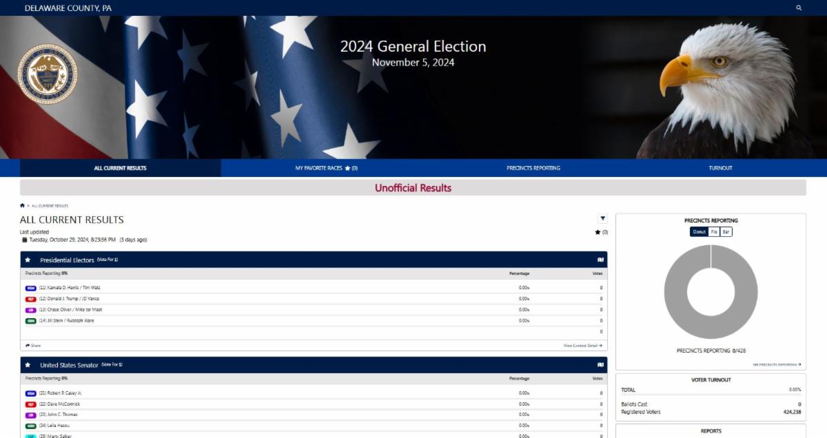 Delaware County residents can access unofficial election results for the Nov. 5, 2024, General Election on Election Night after polls close at 8:00 p.m. Unofficial results will be posted online at DelcoPA.gov/Results as votes are tallied, including those from mail-in, absentee, and in-person ballots, with updates continuing through the counting of provisional and military ballots.