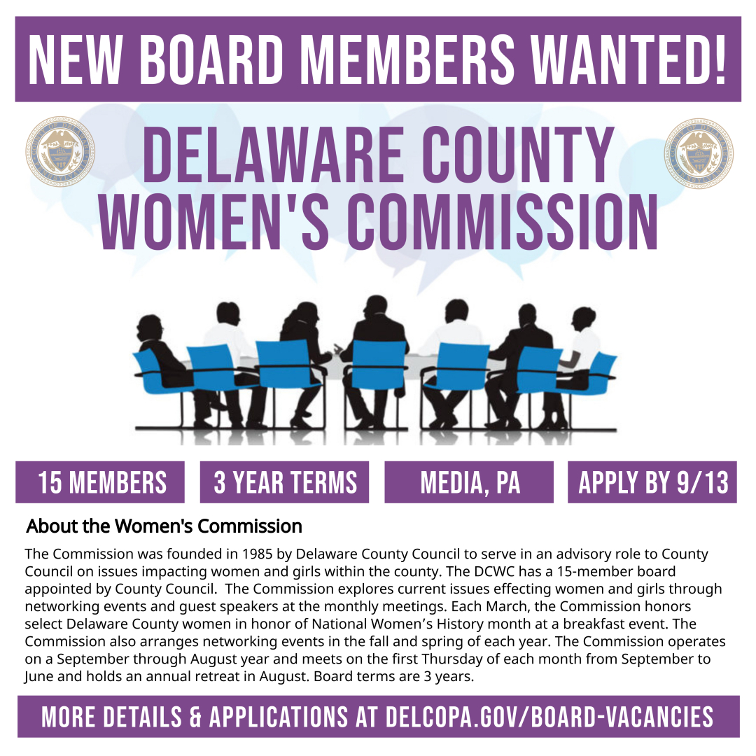 Delaware County is accepting applications to fill multiple vacancies on the Delaware County Women’s Commission, the 15-member advisory body that focuses on issues impacting women and girls within the county. Applications will be accepted through Friday, September 13.