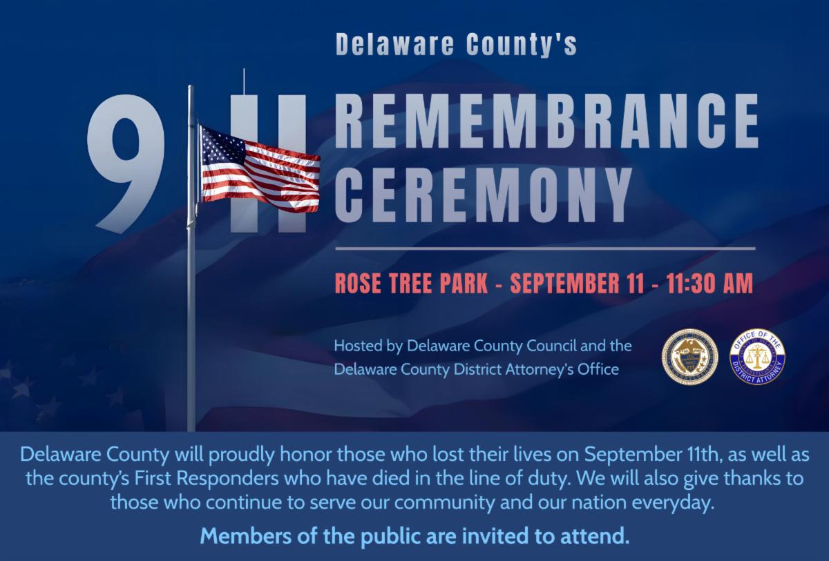 Reminder! Delaware County’s annual September 11th Day of Remembrance Ceremony, hosted by Delaware County Council and the District Attorney’s Office, will take place on Wednesday, September 11, at 11:30 a.m. at Rose Tree Park, located at 1671 N. Providence Road in Media, PA.