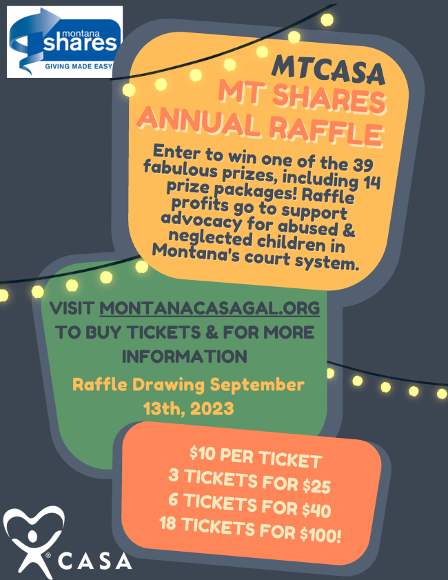 MTCASA is now a proud member of MT Shares, a partnership of Montana-based nonprofit groups devoted to improving the quality of life in the communities throughout the state. MT Shares hosts an annual raffle with prizes from across Montana to raise money for their members. Raffle ticket sales go to support advocacy for abused and neglected children in Montana's court system.