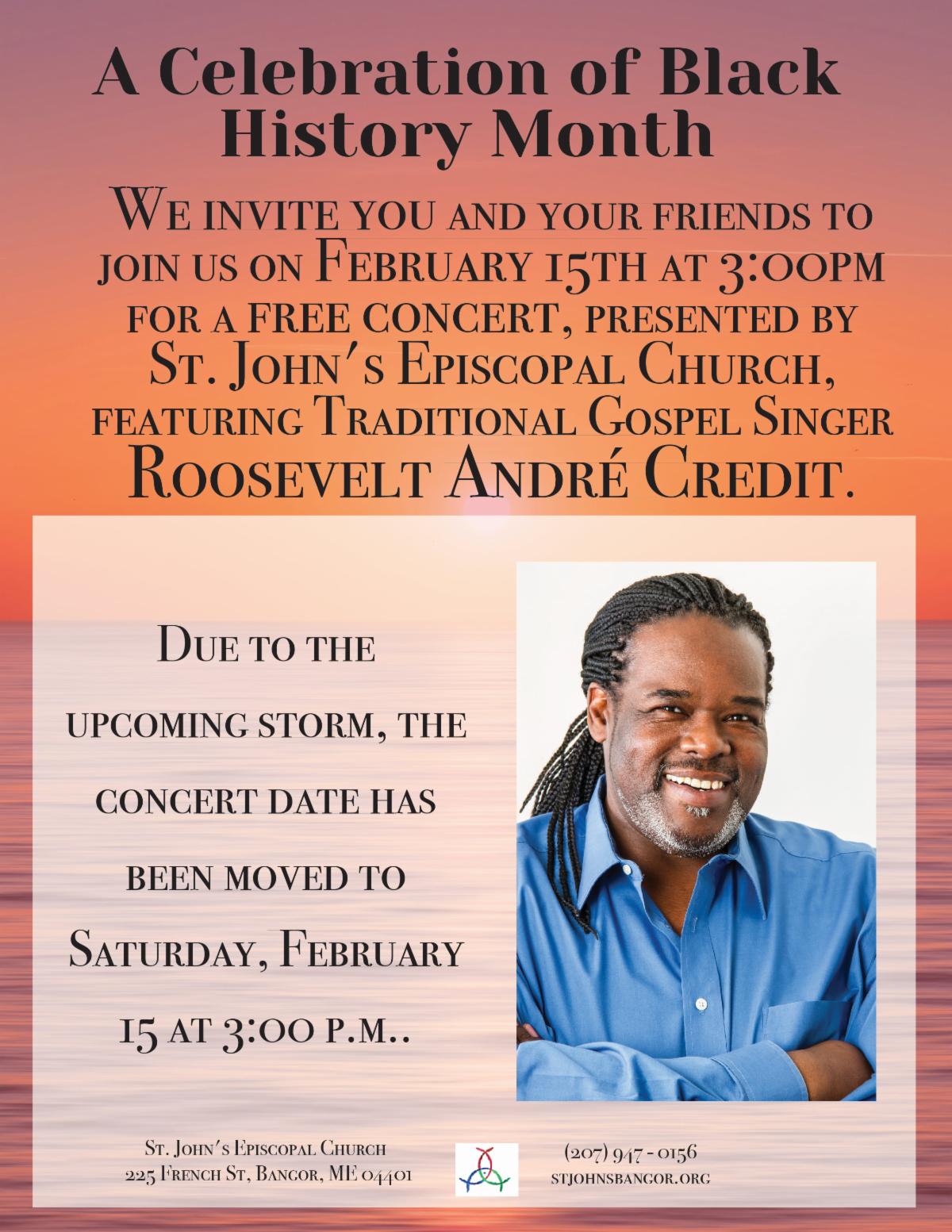 St. John's in Bangor will host a concert by traditional gospel singer Roosevelt André Credit, a bass-baritone, who has performed at the Met, on Broadway, and in award-winning films.such as "12 Years a Slave." Roosevelt is also a member of The Choir of St. Ignatius Loyola in New York, and a composer, conductor, and recording artist. The concert is open to all and free. Learn more here.
