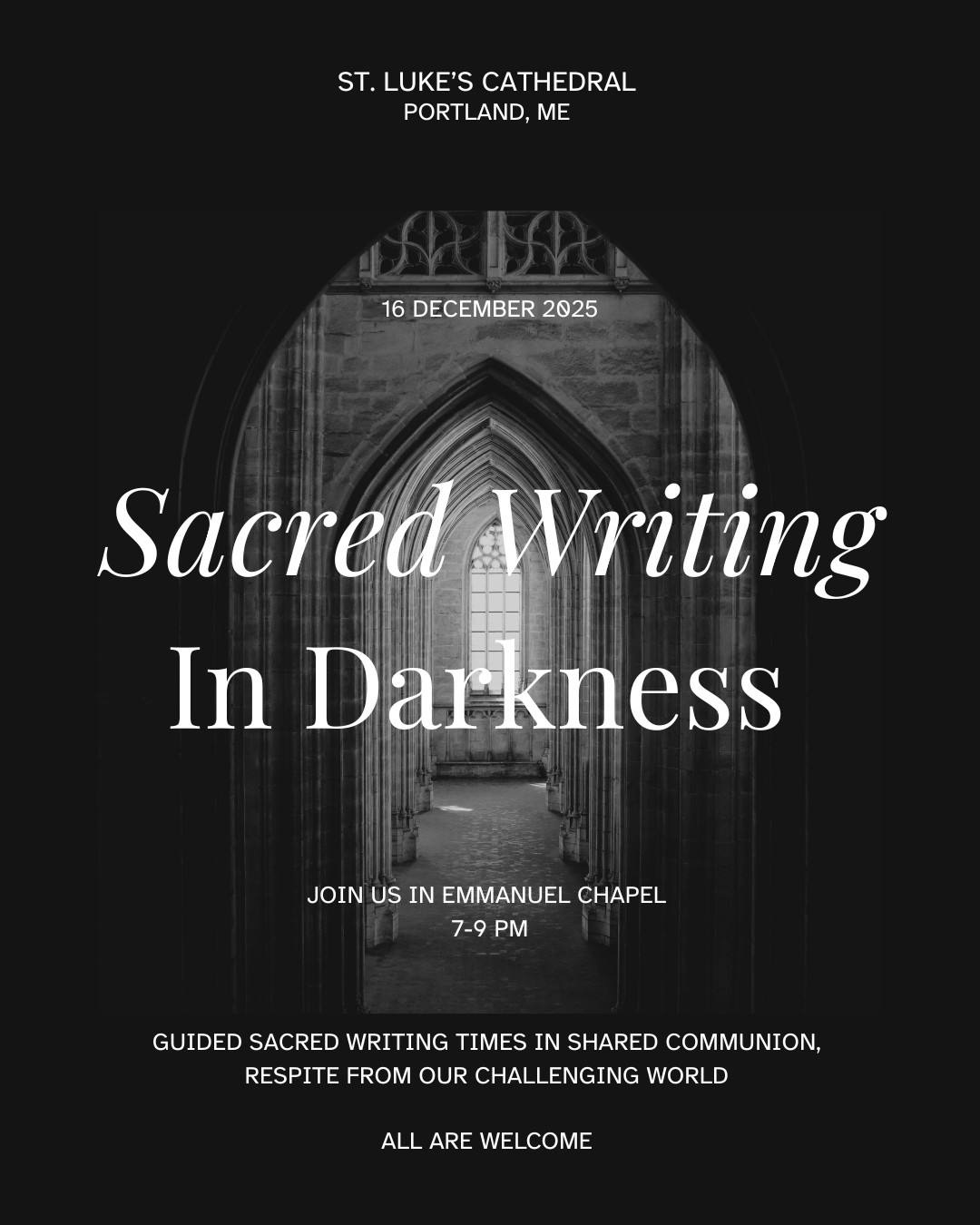 Poets Shana Rose, a parishioner at St. Luke's, and Julia Baker, chaplain at Mercy Hospital and parishioner at St. Alban's, Cape Elizabeth, are hosting a new ecumenical ministry at St. Luke's Cathedral. “Sacred Writing in Darkness,” will be a time every month for guided sacred writing—poetry, prayers, songs, vignettes, etc—with a different theme every session. The gatherings are designed to help spiritually feed participants longing for respite from the chaos of our wider world right now. They will begin with Baker and Rose providing simple grounding content like a prayer or brief message, and the rest of the sessions will be for participants to write, followed by time at the end for sharing their completed work.