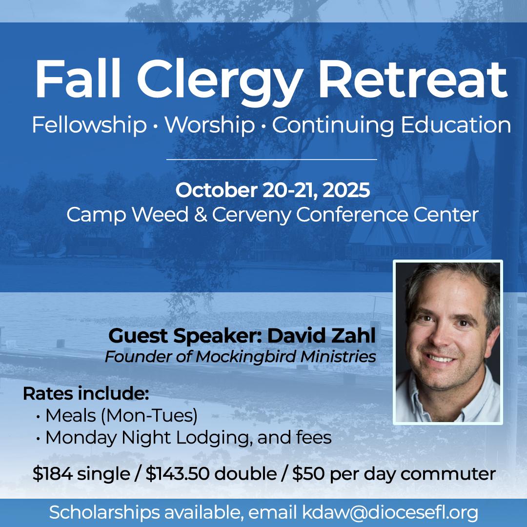 The annual fall clergy retreat for all clergy of the Diocese will start with lunch at 12 p.m. on Monday, October 20 and conclude on Tuesday, October 21 at 2 p.m.