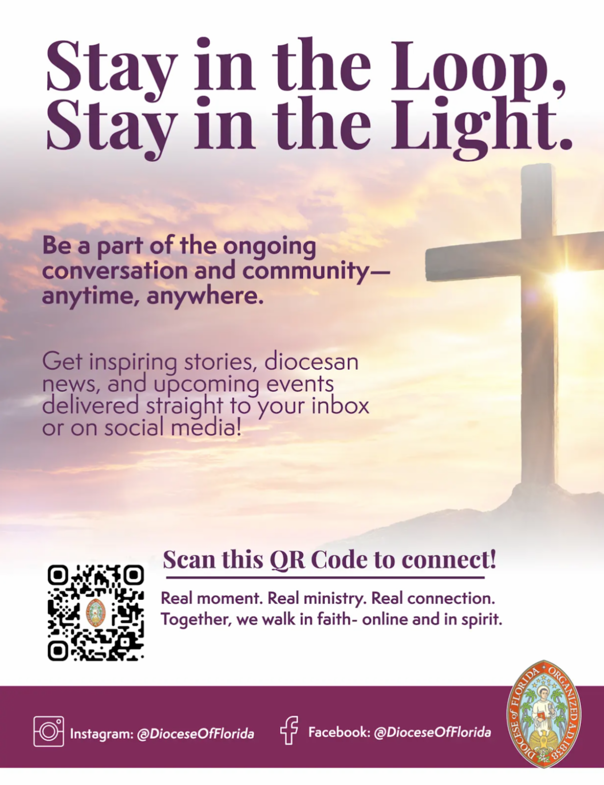 We’re asking every parish to include the “Stay in the Loop, Stay in the Light” bulletin insert each Sunday in September. It features a QR code that links directly to the Diocesan Digest newsletter sign-up, Facebook, and Instagram. An email was sent to all clergy, senior wardens, and parish administrators with all the details.
