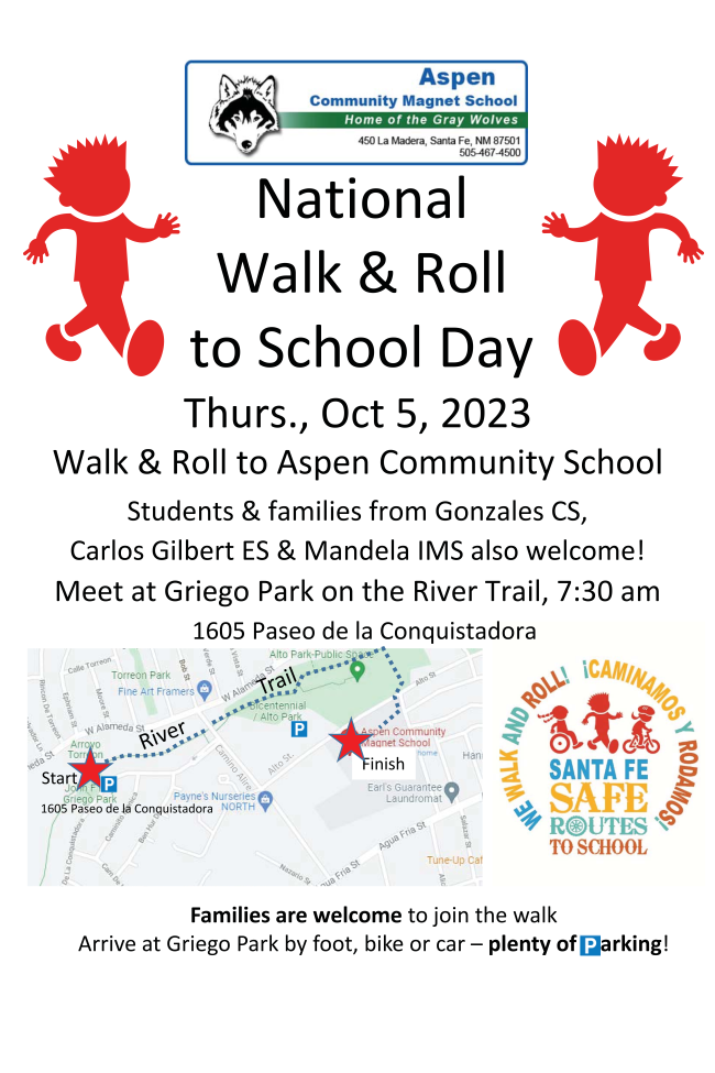 Hello Santa Fe Safe Routes to School partners: Here is a gentle reminder that National Walk and Roll to School Week has arrived! Please consider joining one of the dozen walk and roll to school processions that we will be supporting this week and later in the month. Most of the events are held on a weekly basis so if you can't join this week, please feel free to join any time you can make it. Please see sfct.org/safe-routes-to-school/safe-routes-to-school-encouragement for details. If your school is not already part of the celebration, consider pulling a walk-to-school group together, or just vote with your own feet for a fun and healthy way to get to school.