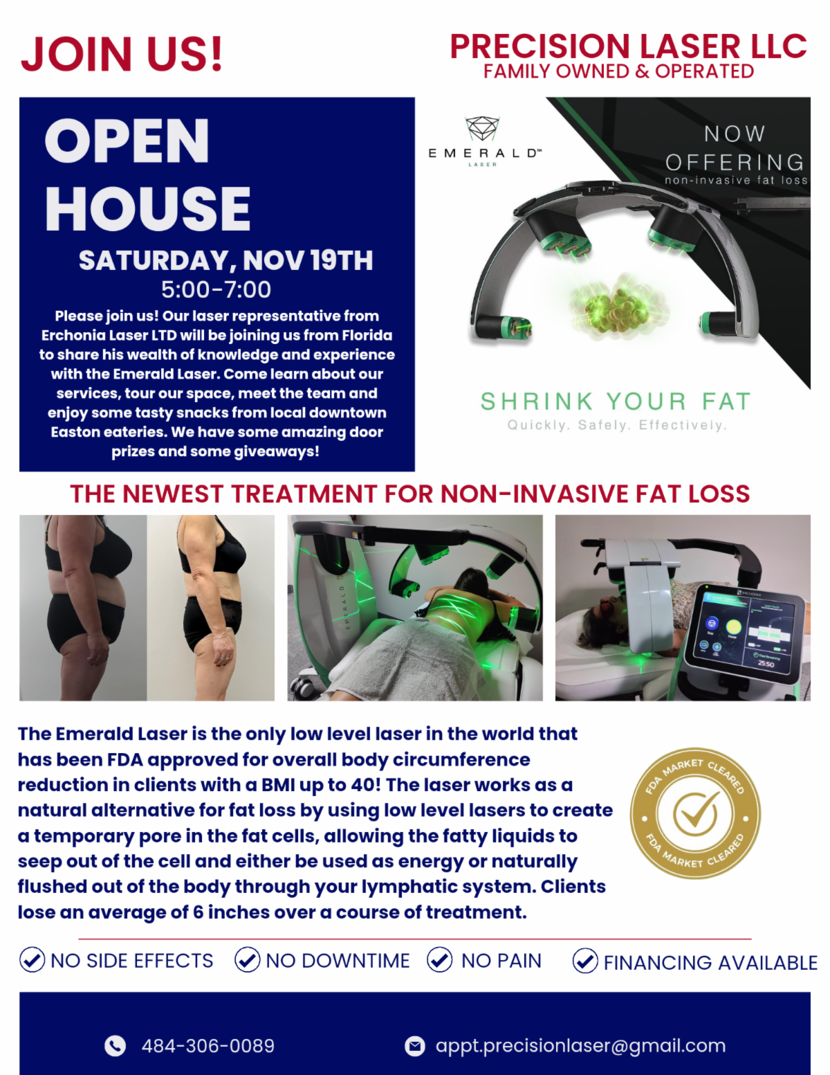 Precision Laser will be hosting an open house on Saturday evening featuring their laser representative to discuss their new emerald laser.
