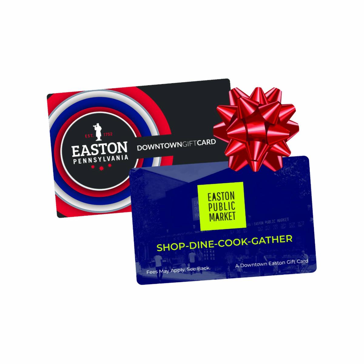 Downtown Easton gift cards are valid at 40+ merchants in Downtown (including EPM vendors), and Easton Public Market gift cards are valid at all merchants.