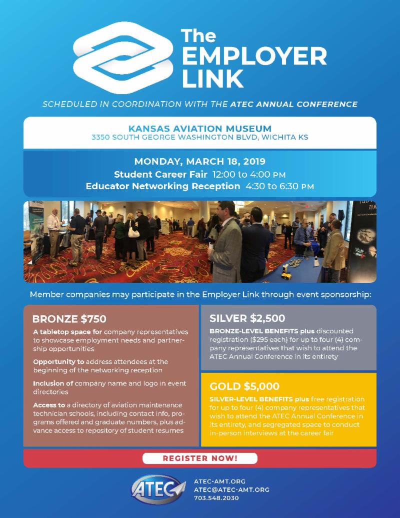 For the third straight year, ATEC will host the Employer Link, a unique event intended to connect employers with students, educators, and administrators from aviation technical education programs from around the country.