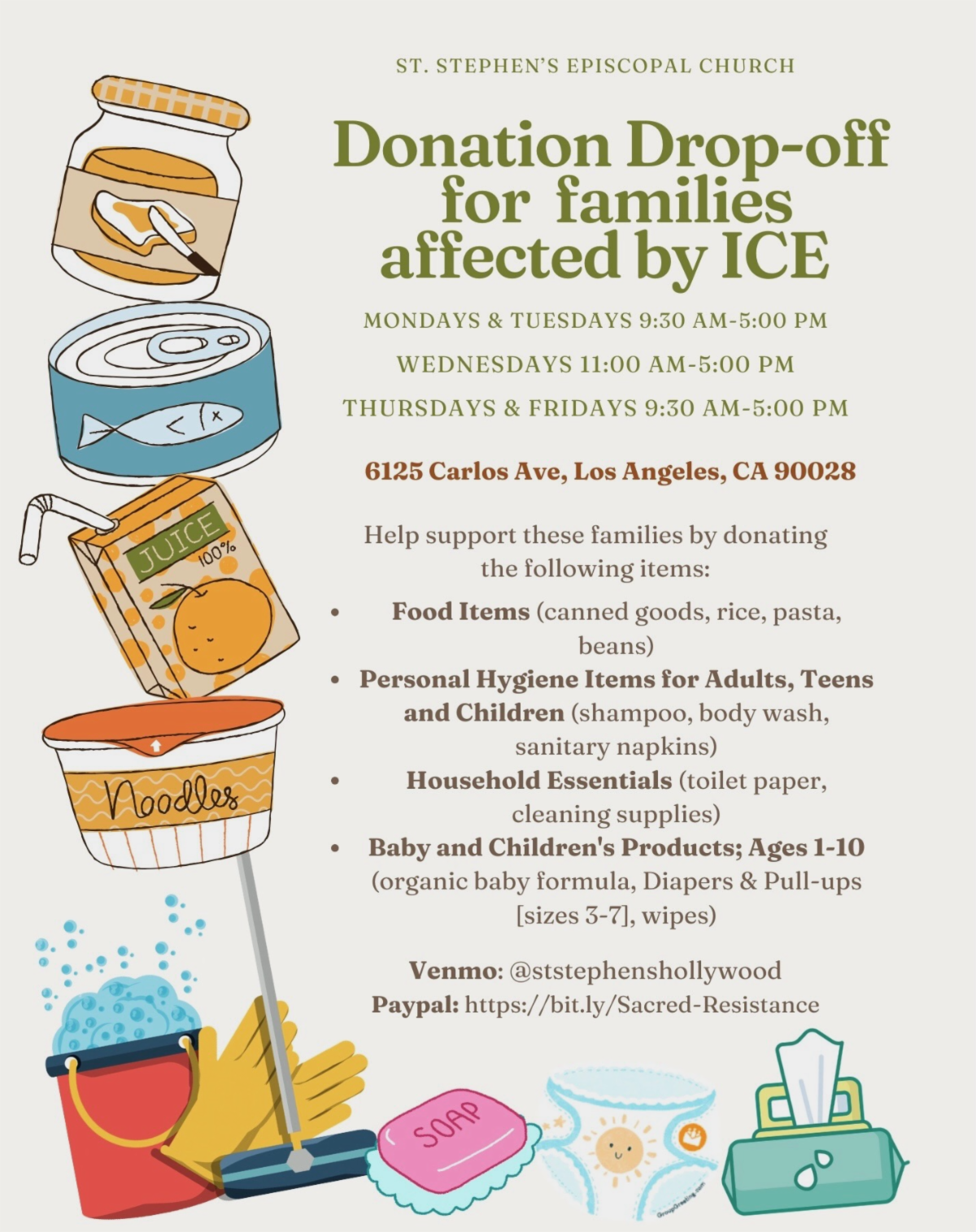 Sacred Resistance — the immigration justice ministry of the Diocese of Los Angeles — is organizing donations for families affected by ICE raids, seeking shelf-stable food donations, personal hygiene items, household essentials, and baby products, in addition to financial donations.