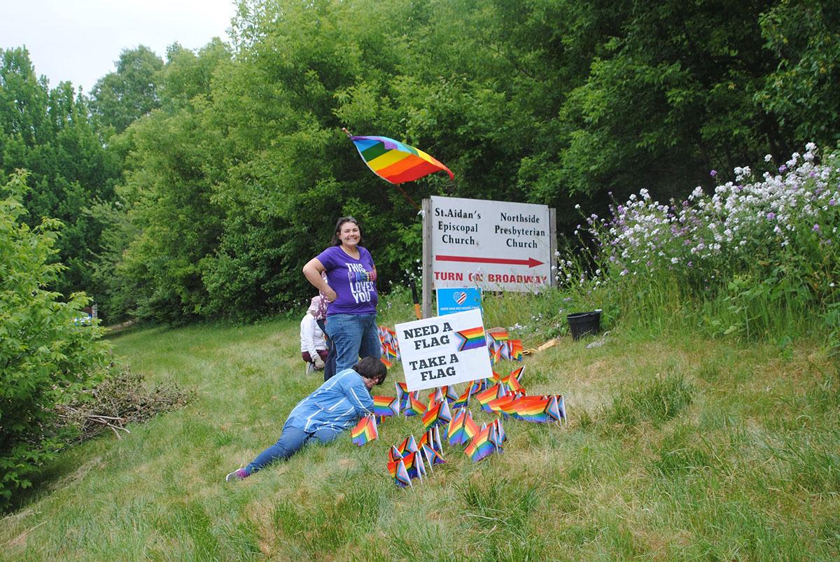 [Episcopal News Service – June 20, 2023] After their LGBTQ+ pride flag was vandalized twice this spring, the combined community of St. Aidan’s Episcopal Church and Northside Presbyterian Church in Ann Arbor, Michigan, planted 300 miniature pride flags with a sign that reads, “Need a Flag, Take a Flag.”