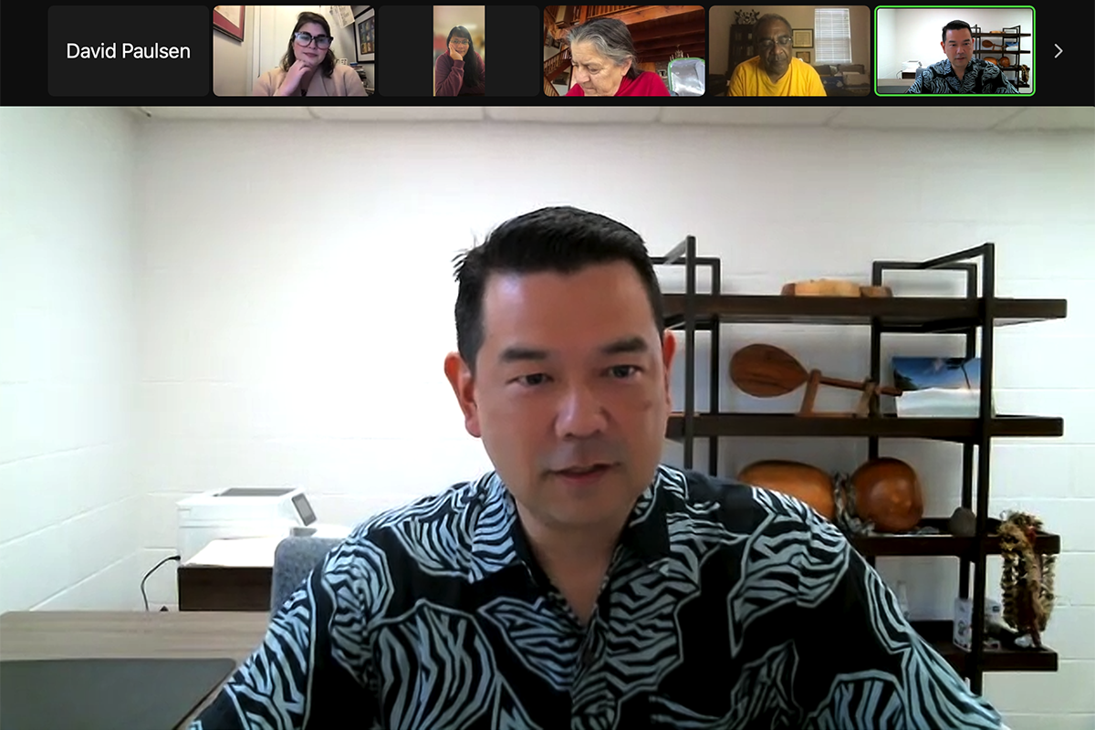Presiding over the 2023 meeting of Diocesan Convention, Bishop John Harvey Taylor is flanked by Canon Steven Nishibayashi, secretary of convention; Canon Melissa McCarthy, canon to the ordinary; and Canon Richard Zevnik, chancellor. Photos: Janet Kawamoto | |