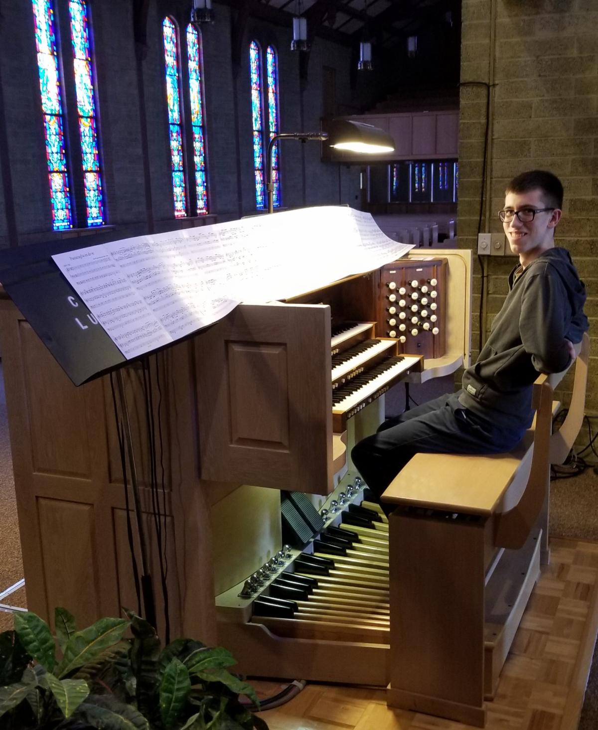 Three years ago, Andresen became fascinated by the organ. He launched into learning Michael McCabe’s Two Trumpet Tunes (see videos: Trumpet Tune in C and Trumpet Tune in A) and instantly demonstrated a natural affinity for the instrument. Since then, he has been featured organist for Lewis and Clark’s production of Wilder’s Our Town and has presented a postlude at Central Lutheran Church.