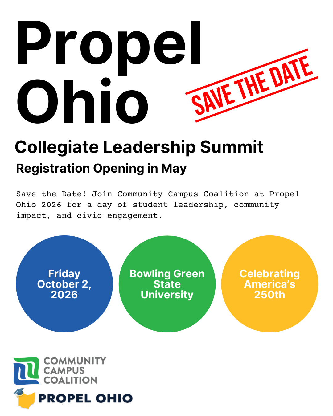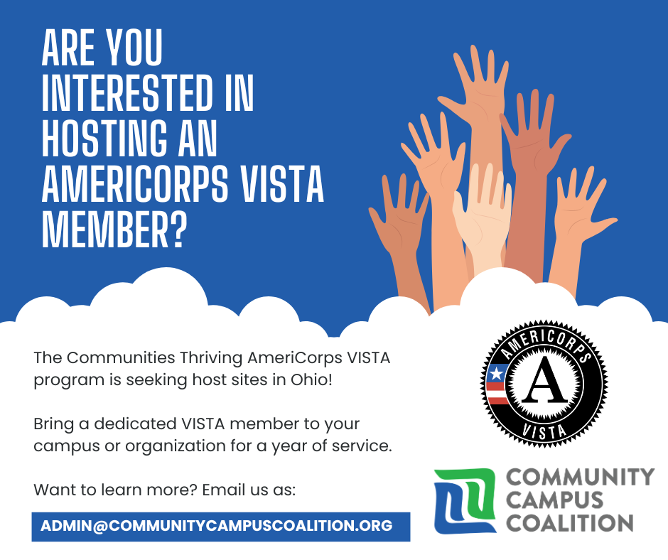 Save the Date | Propel Ohio 2026 - Oct. 2, 2026 | Propel is back! Join Community Campus Coalition on Friday, October 2 at Bowling Green State University for an inspiring day of student leadership, community impact, and civic engagement. This year’s theme—America’s 250th—will spark meaningful conversations and action. Registration opens in May! | | | | VISTA Opportunity at Marietta College | | |
