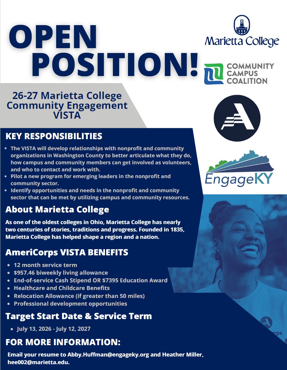Marietta College is seeking a passionate changemaker for its 2026–2027 Community Engagement VISTA position in partnership with the Community Campus Coalition. This 12-month AmeriCorps role focuses on building nonprofit partnerships, strengthening campus-community connections, and supporting emerging leaders.