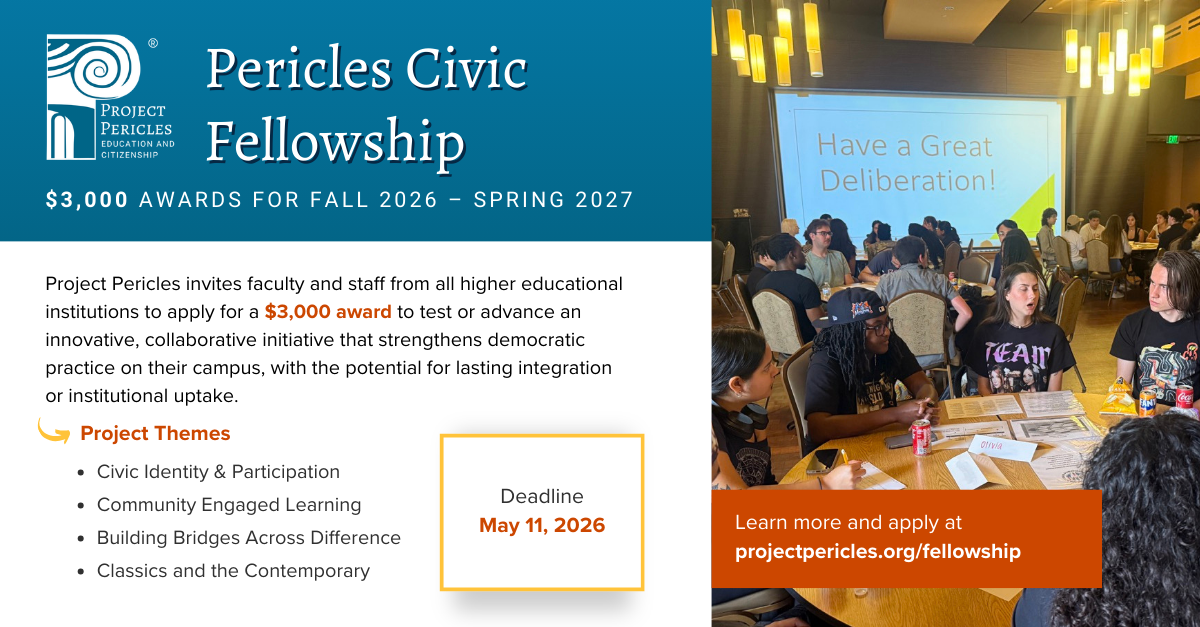 Project Pericles is now accepting applications for its Civic Fellowship, offering $3,000 awards for faculty and staff to develop civic learning projects in classrooms and communities.