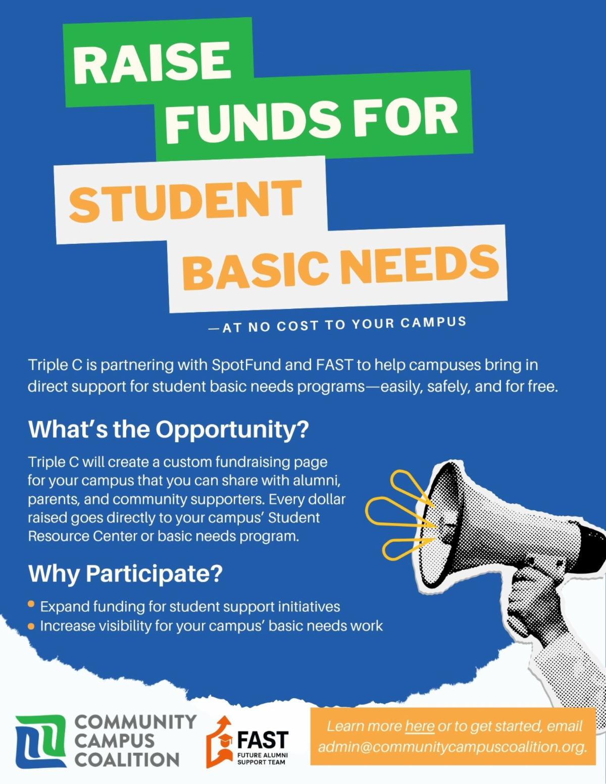 Did you know your campus can partner with Triple C to raise direct support for your Student Resource Center or basic needs programs—at no cost?