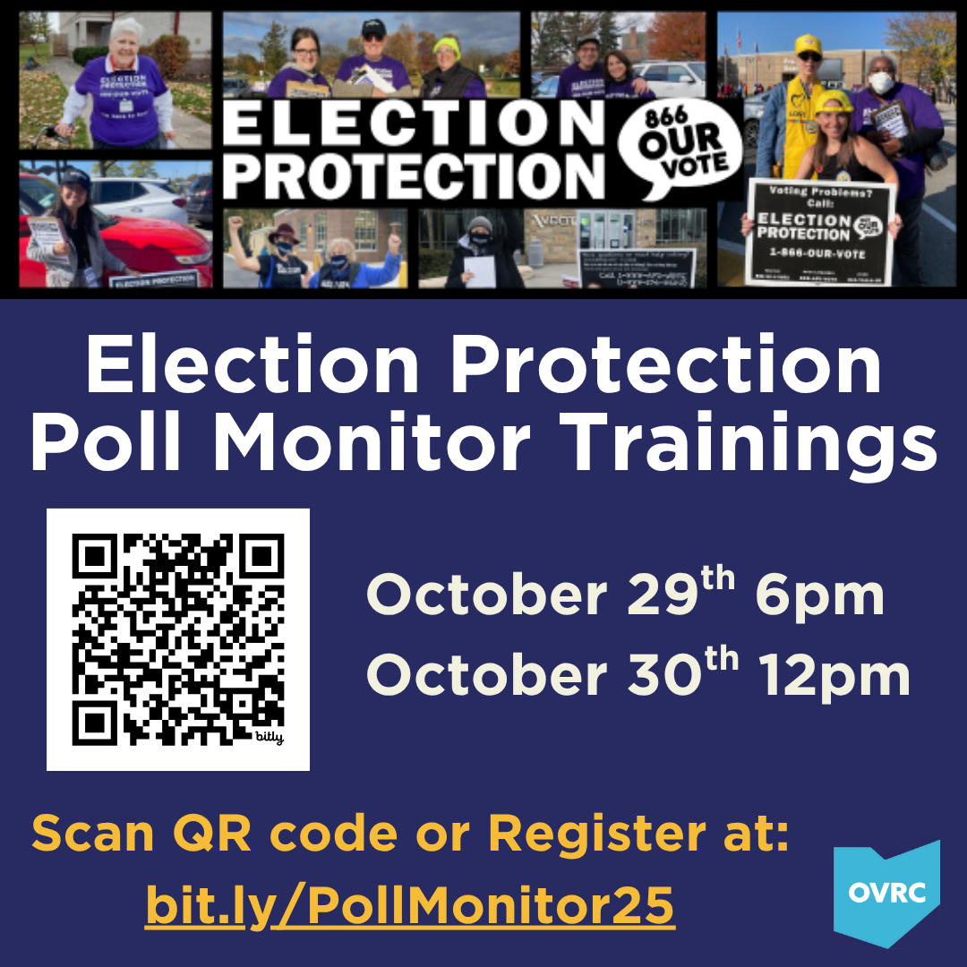 The Election Protection Team at the Ohio Voter Rights Coalition is seeking volunteers to help ensure a smooth and fair election this November. Nonpartisan poll monitors, including roving poll monitors who visit multiple polling locations on Election Day, are needed in key Ohio counties, including Athens, Butler, Clark, Clermont, Cuyahoga, Delaware, Franklin, Greene, Hamilton, Licking, Lorain, Lucas, Mahoning, Montgomery, Portage, Stark, Summit, Trumbull, and Wood.