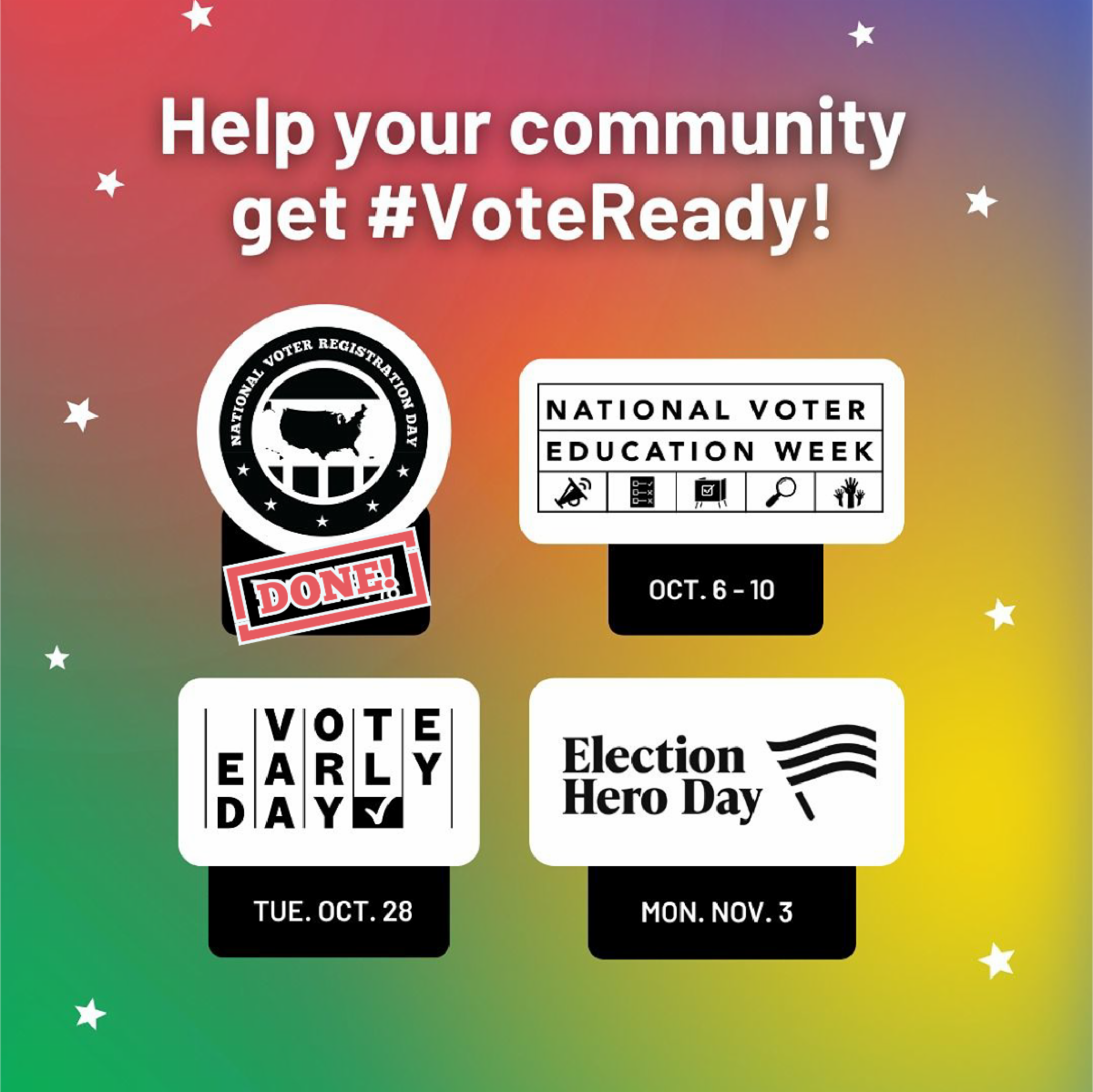 This fall, the Civic Holidays offer opportunities to engage your community and support voter participation. Vote Early Day (Oct. 28) encourages planning ahead, and Election Hero Day (Nov. 3) honors the poll workers and election officials who make democracy possible.