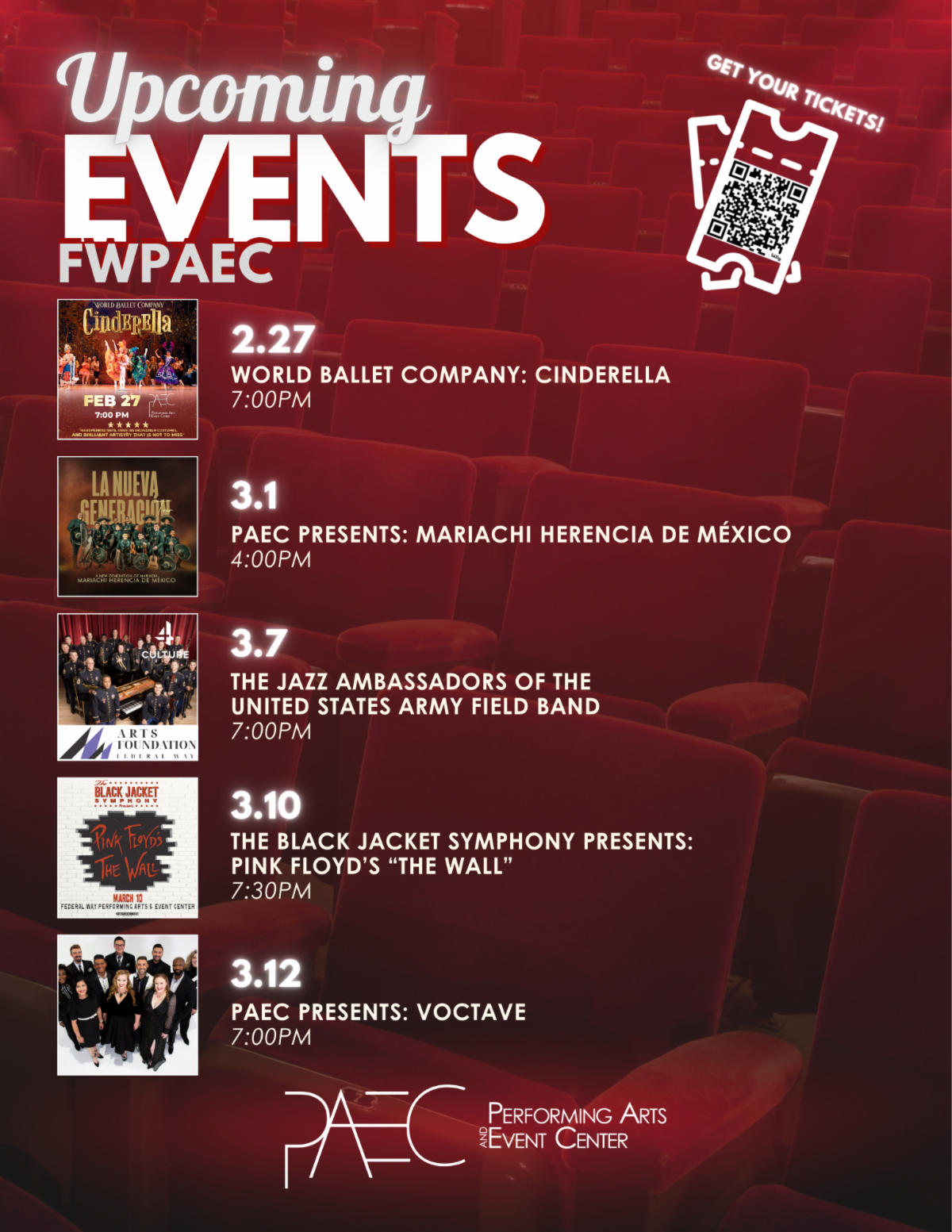 The Federal Way Performing Arts & Event Center (PAEC) puts on a wide variety of events year-round. Upcoming events include: