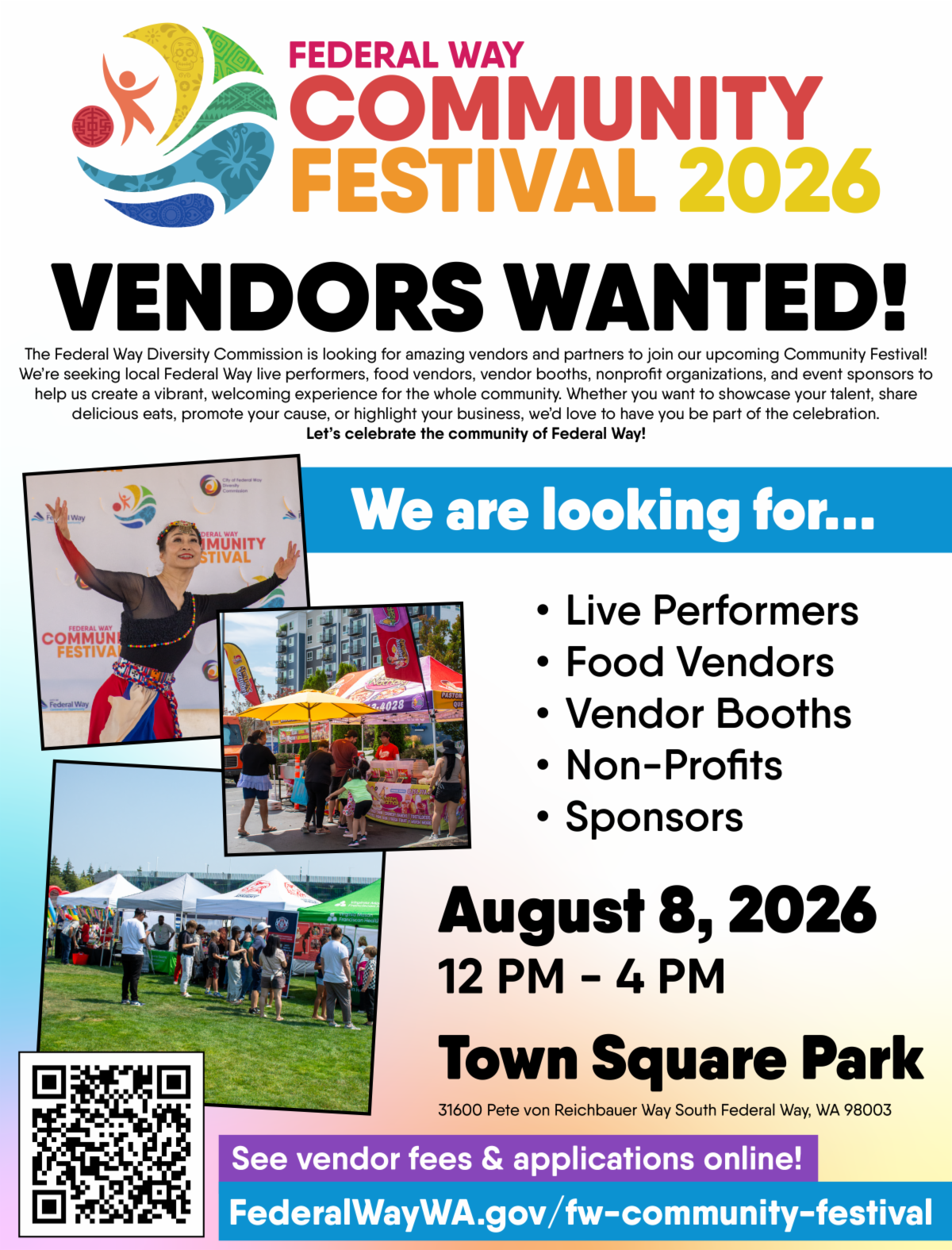 We’re seeking local Federal Way live performers, food vendors, vendor booths, nonprofit organizations, and event sponsors to
