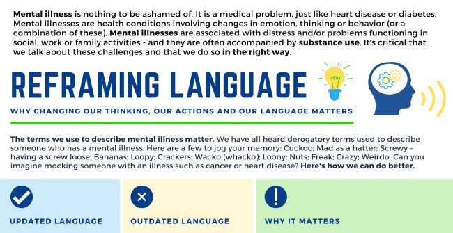 During Children's Mental Health Acceptance Week, May 1st - 7th , we will focus on the importance of shifting from awareness to acceptance . We hope to inspire new thinking and behavior that better supports the mental health of children and youth and their families. Our new infographic, Reframing Language, was designed along with the NFSTAC team to do just that - change our thinking and the way we talk about mental health and about individuals who experience mental health and/or substance use challenges. View the full infographic here.