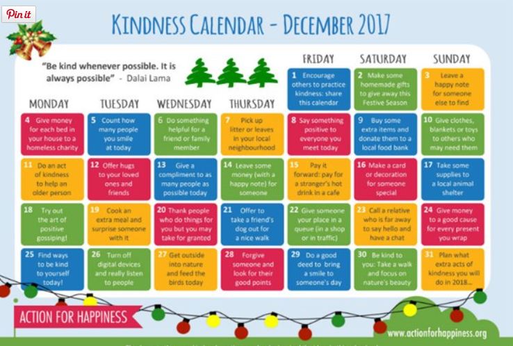 This Kindness Calendar has suggested good deeds to do throughout December 2018 to help spread a little more happiness in our communities.