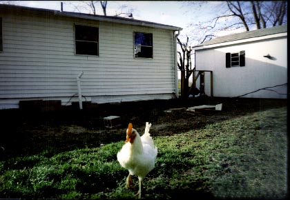A plump white bird with ragged, dirty feathers, the chicken took only a few halting steps at a time, examining her surroundings carefully. What was she seeing through those bird’s eyes? What did this landscape that still felt so new to me look like to her? How did she see the “pump shed” or that triple-trunked birch tree? I knew that I couldn’t guess.