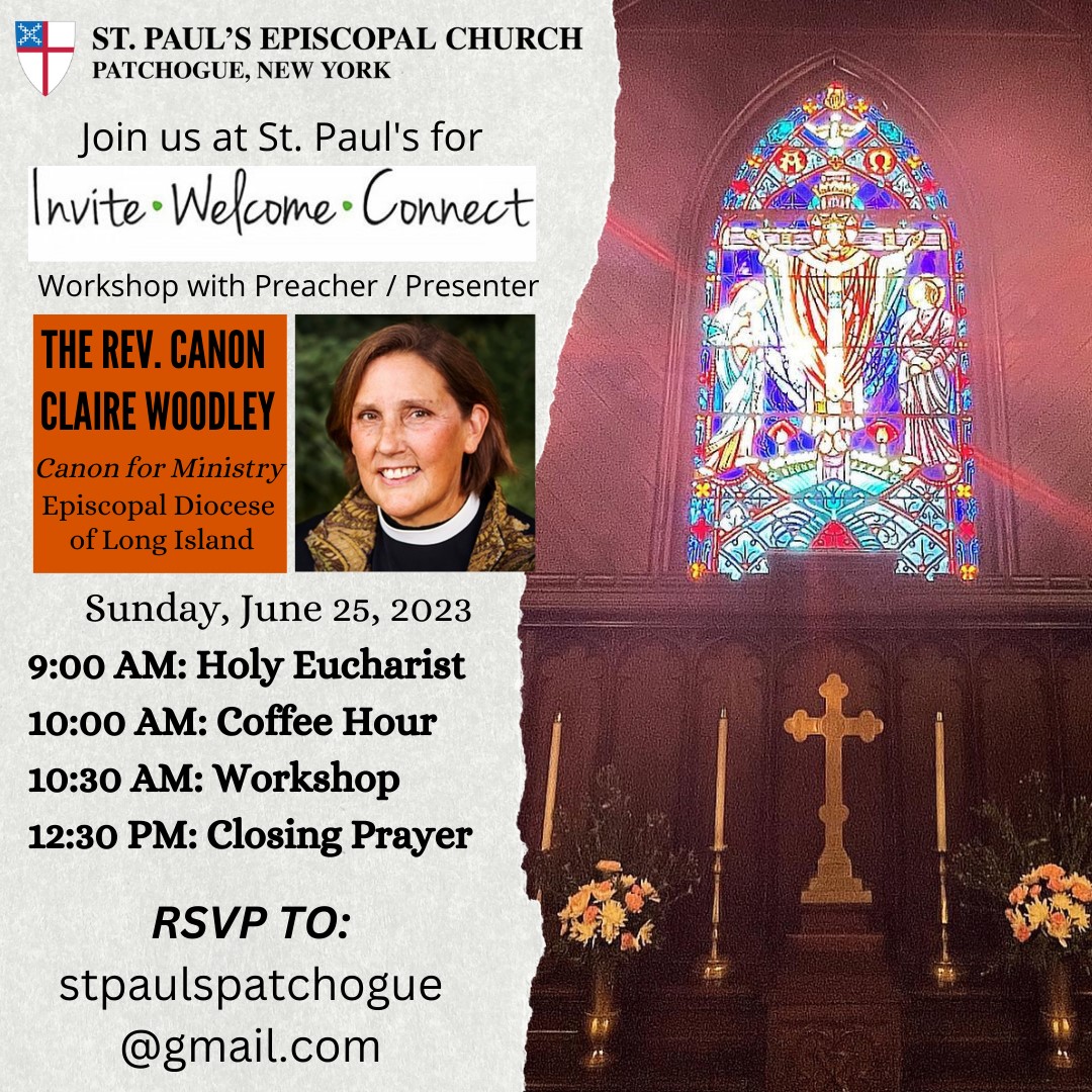 Invite + Welcome + Connect is an intentional ministry to welcome, retain and include newcomers in a parish’s ministry. We have a congregational opportunity to help grow St. Peter’s ministry together, by attending a workshop with the Reverend Canon Claire Woodley, Canon for Ministry for the Episcopal Diocese of Long Island to be presented at St. Paul’s Church in Patchogue on Sunday, June 25, beginning at 10:30am. Any member of our parish family who is interested in attending the workshop is invited to do so. Please let Mother Doyle know of your interest so that reservations may be made for St. Peter’s attendees.