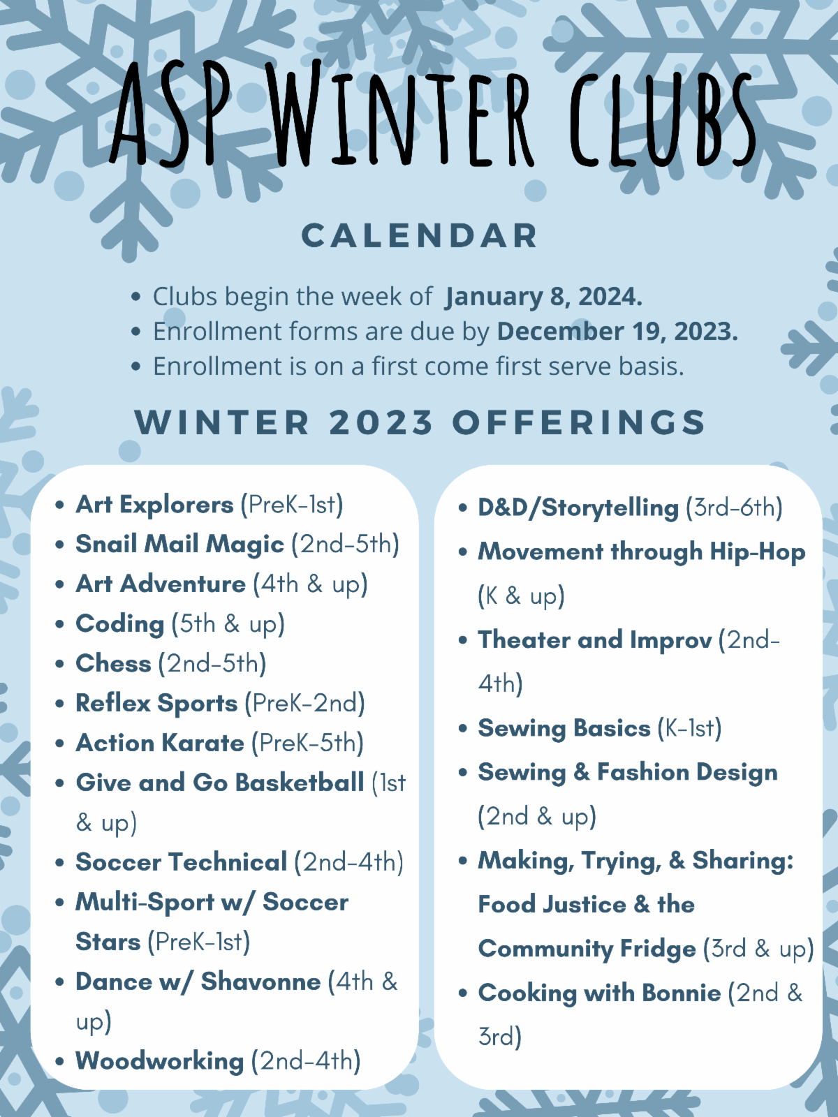 Deadline to register for ASP Winter Clubs: Tuesday, December 19, 2023. Register HERE.