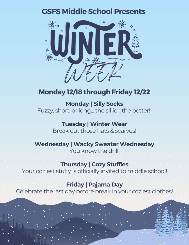 The Middle School will be hosting a "Spirit Week,"during the week of December 18th to 22nd. Check out the daily themes, and come to school feeling the spirit! | |