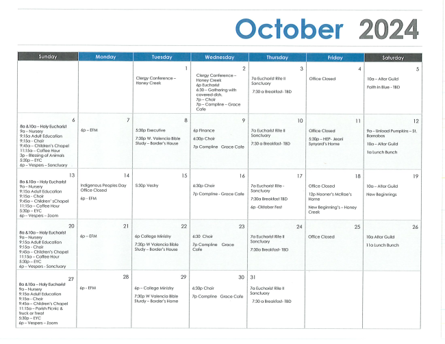 As of September 12th, the Thursday morning Eucharist is being held in the church nave. Service starts at 7:00am. All Valdosta area Episcopal churches are involved in this service. The group will go the breakfast afterwards. We hope to see you there.