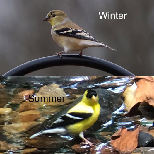 • Have you been wondering where your Goldfinches went this winter? Well, they may have been hiding in plain sight all along! In winter, they sport their winter feathers which are drab brown or a dull yellow-green. The winter feathers make it harder to distinguish the males from the females and sometimes they are mistaken for sparrows at first glance. However, in the coming weeks, the males will begin to molt into their brilliant yellow plumage they are best known for!