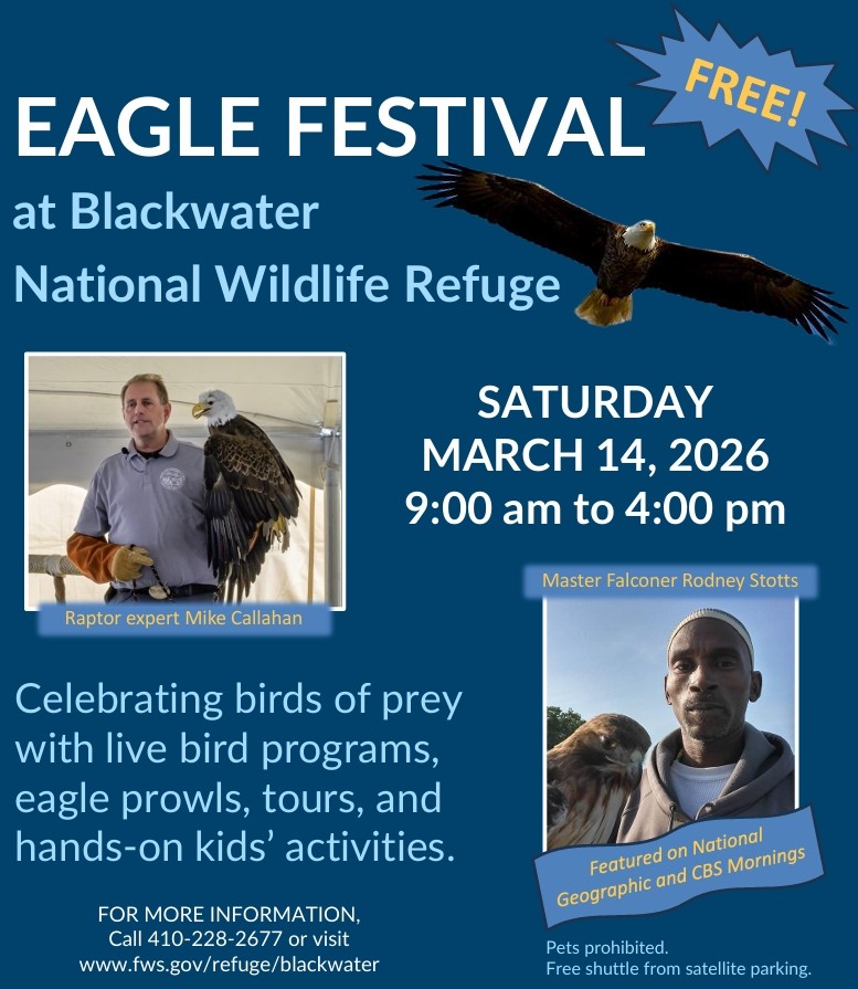 This year's Eagle Festival will be on March 14, 2026. Experience live eagle and other birds of prey programs, kid’s activities, tours, nature and conservation exhibits, food all day and more!