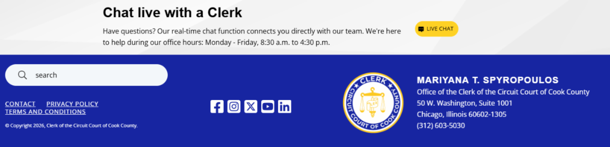 WebChat: The Clerk's website now has a customer service WebChat. Users can reach our Call Center Clerks for general questions or assistance anywhere on the site. The WebChat box is located at the footer of every page. Service is available Monday through Friday, 8:30 AM to 4:30 PM.