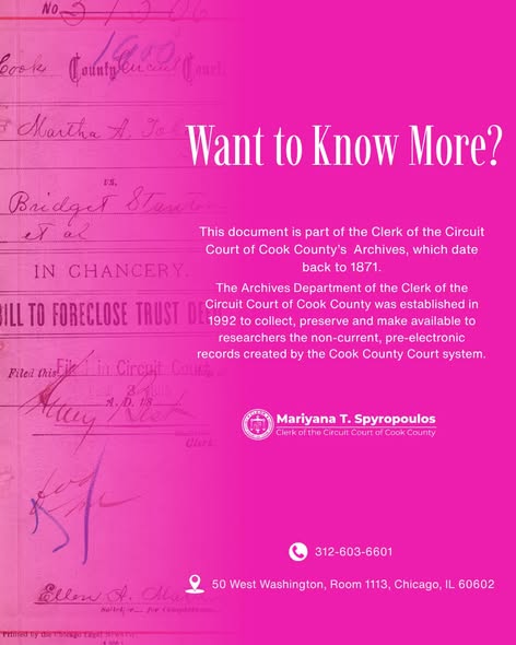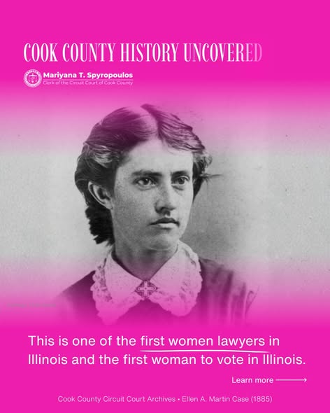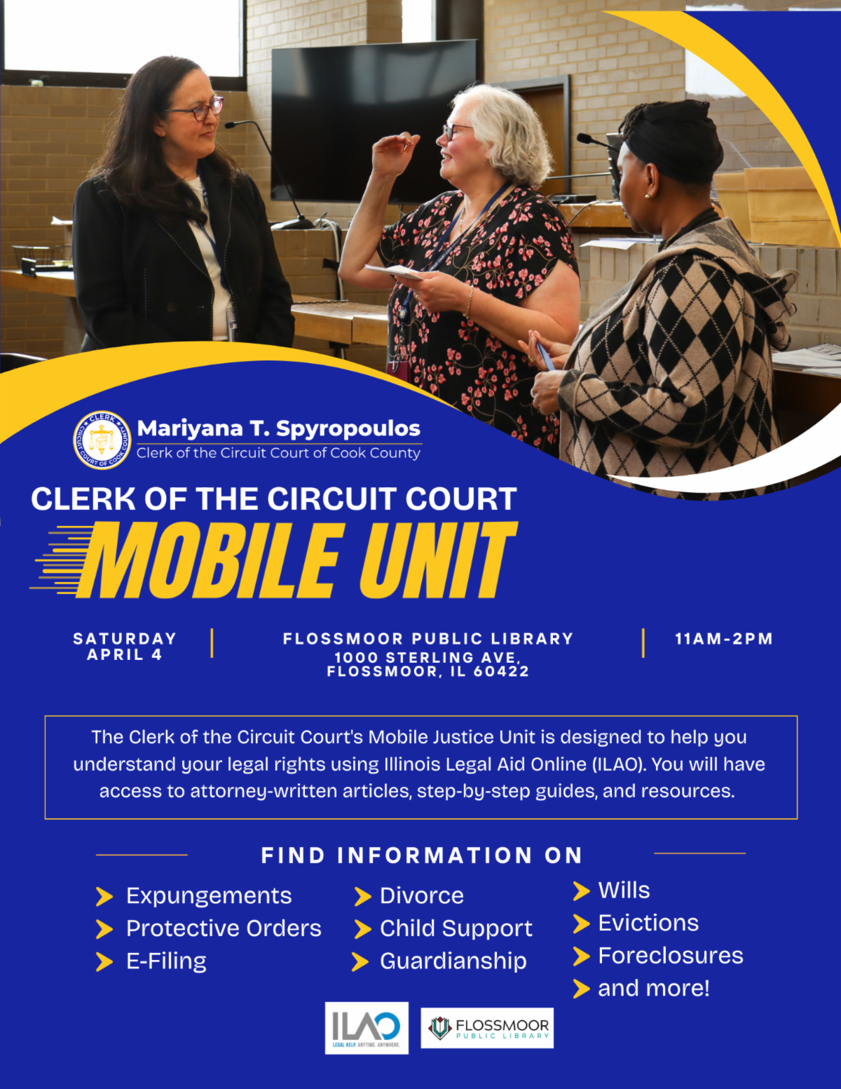| | Our Archives preserve the stories that helped shape Cook County. Ellen A. Martin was one of Illinois’ first women lawyers and helped pave the way for women’s voting rights through her work and advocacy. Learn more! | | The Clerk's Office is taking the Clerk of the Circuit Court Mobile Unit to the Flossmoor Public Library. This Mobile Unit is designed to help you understand your legal rights using Illinois Legal Aid Online (ILAO). You will have access to attorney‐written articles, step‐by‐step guides, and resources. | | |