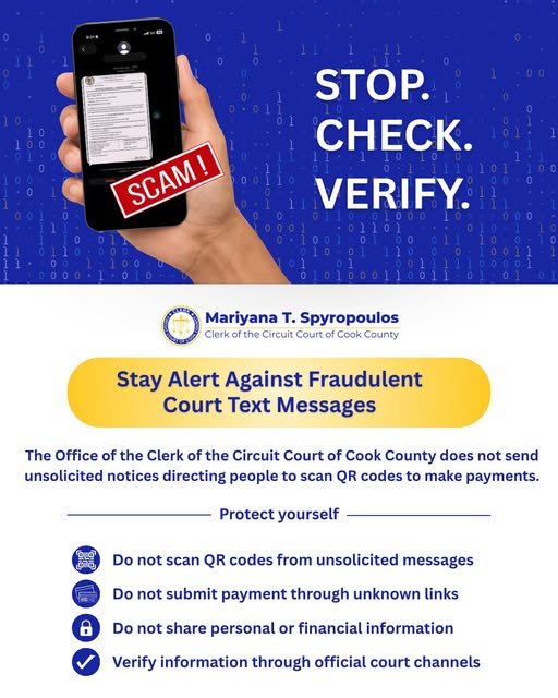Our office does not send unsolicited text messages requesting payment or directing residents to scan QR codes. We encourage residents to verify any court communication through official Clerk of the Circuit Court of Cook County sources.