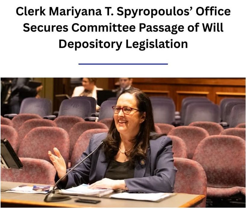 | | Will Depository Legislation | | Last month, the Office of the Clerk of the Circuit Court of Cook County secured the passage of Senate Bill 3291 out of the Senate Judiciary Committee, marking a major step forward for legislation spearheaded by Clerk Spyropoulos’ Office to establish a statewide, optional, county-level will depository system in Illinois. | | |