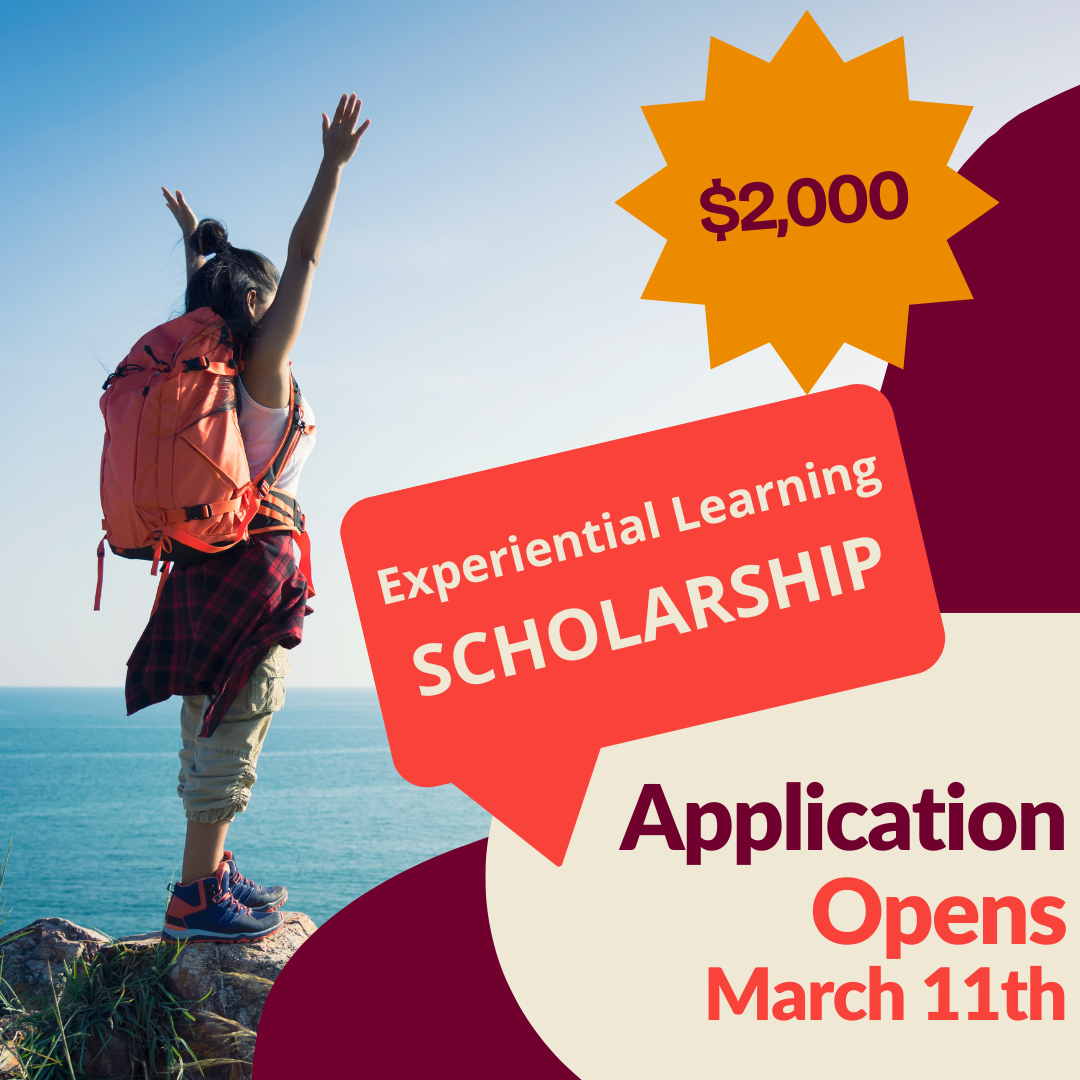 Are you applying for a low-paid internship, trying to fund a research or service project, or wishing you could afford to study abroad? Apply for an Experiential Learning Scholarship! Students may apply for up to $2,000. | |